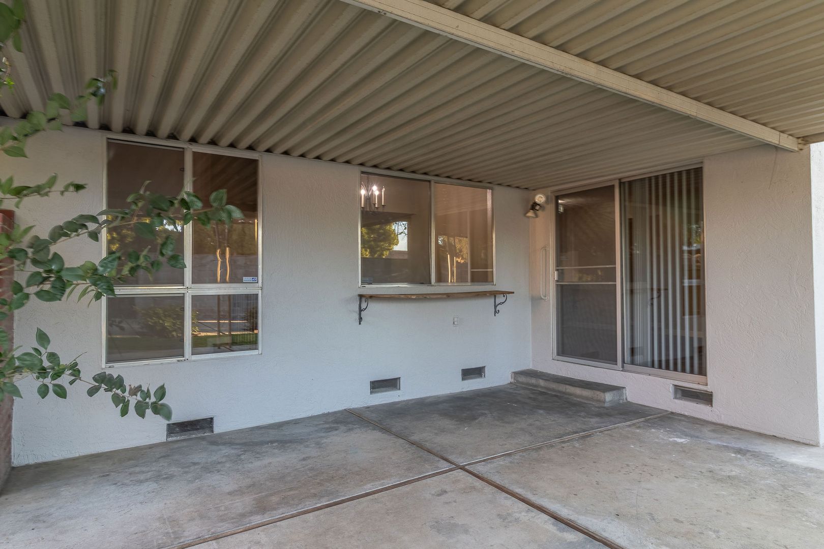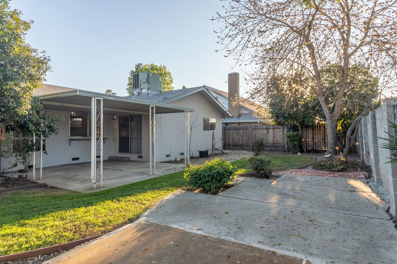 -Fenced backyard with covered patio area and mature landscaping